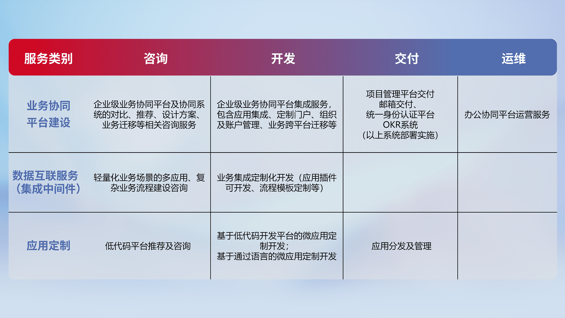 针对钉钉、、企微、、、、IDaas等平台级产品提供产品的规划、、、方案、、交付、、、、定制化开发等服务,,,实现如统一协同办公、、智能客户服务、、、、混合会议管理、、、、智能数据查询、、、、等业务场景,,实现数字化转型。。。。