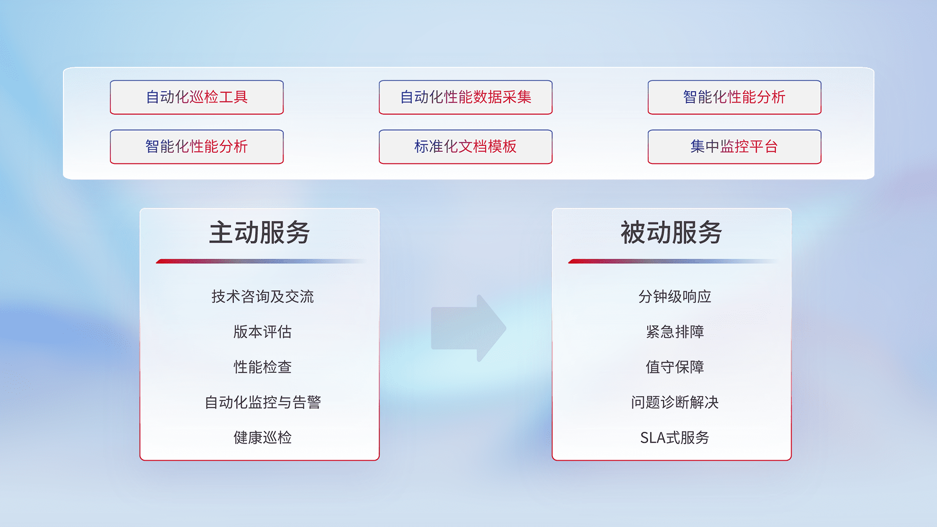 智能化工具和标准化文档,,,保障服务质量,,提供主动服务(包含技术咨询、、、、版本评估、、、性能检查、、自动化监控与告警、、、、健康巡检)和被动服务包含(分钟级响应、、、紧急排障、、、值守保障、、、问题诊断解决、、、SLA服务)。。。
